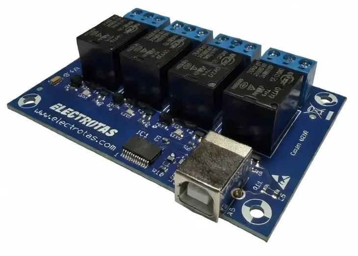 El conversor USB – 4 Relay es la herramienta perfecta para ayudarlo en sus proyectos de robótica y automatización. Podes controlar mediante el puerto USB de una pc el estado de los 4 Relay.